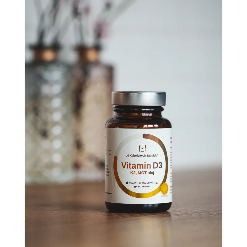 Produkt D3 obsahuje 2000 IU vitaminu D3 v jedné kapsli. Vitamin D3 je z rostlinného zdroje, z lišejníku a je proto vhodný i pro vegany. Je navíc doplněný o vitamin K2 v patentované stabilní formě K2VITAL®. K2VITAL® je obchodní značka pro vitamin K2 MK-7 (menachinon-7), který je vysoce biologicky dostupnou formou vitaminu K2. Kapsle jsou obohacené o MCT olej, který je z kokosu. MCT olej, neboli olej středně dlouhých triglyceridů, je druh oleje, který se vyznačuje vysokým obsahem triglyceridů se středně dlouhým řetězcem mastných kyselin. Tyto mastné kyseliny mají délku řetězce obvykle mezi 6 a 12 uhlíky, což je kratší než u většiny jiných tuků nacházejících se v běžné stravě. Je důležitý pro vitamin D3 i K2, které jsou rozpustné v tucích.